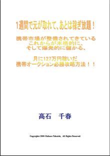 初めまして。自称『携帯オークションの鬼』こと高石です。突然ですが、私のような中卒でも月に100万円以上稼ぐ事が可能なのは、マニュアルに書いてある秘策を用いているからです。ぜひこのマニュアルをご覧いただき、1人でも多くの方に私以上に稼げるようになっていただきたいと思っています。